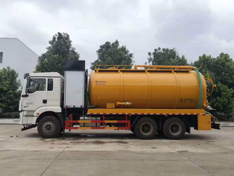 罐體容積約22立方左右,清水罐9立方,其余為污水,罐體8mm厚,封頭8mm厚,舉升頂為自卸中置頂,副駕駛一側清水罐和污水罐用DN100球閥互通,另罐頂裝一個互通;副駕駛一側按照公告圖片安裝爬梯;清水罐:罐頂水泥罐口一個,帶爬梯,帶品浮330高壓泵,尾部液壓卷盤,左右各裝一個消防栓進水口,清水罐裝兩側各一個小球閥,罐底裝一個DN65排水閥。吸污罐:采用濰柴420馬力副發動機,帶42水循環泵,一個水泥罐口,罐內爬梯,污水罐底部201不銹鋼內襯,罐體內部防浪板加固,水箱裝在左側;副駕偷排150鋁合金球閥用氣動閥帶,吸污罐尾部大蓋不開啟,液壓開600小蓋排污;左側一個150球閥排污口,右側兩個100鋁合金球閥;側抽一個100鋁合金球閥;罐體尾部兩側工具箱(左邊工具箱兩層,右側加大),安裝冬季氣吹水,箭頭燈,贈送配件:80米25號高壓管,1根8米吸污管,一個9公斤噴頭。油漆:工程黃